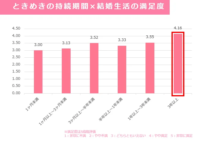 その結果、「3年以上続いた」夫婦は結婚満足度が平均4.16(5段階評価)と非常に高く、 「半年〜1年未満」で終わった夫婦(3.33)、「1か月未満」で終わった夫婦(3.00)を大きく上回りました。